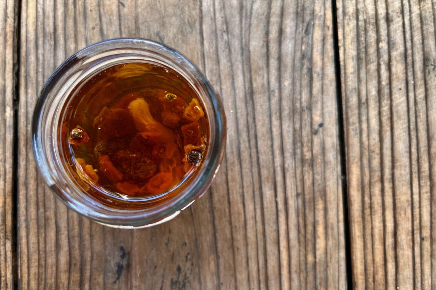 1:小瓶にレーズン、ローズヒップ、水を入れる。